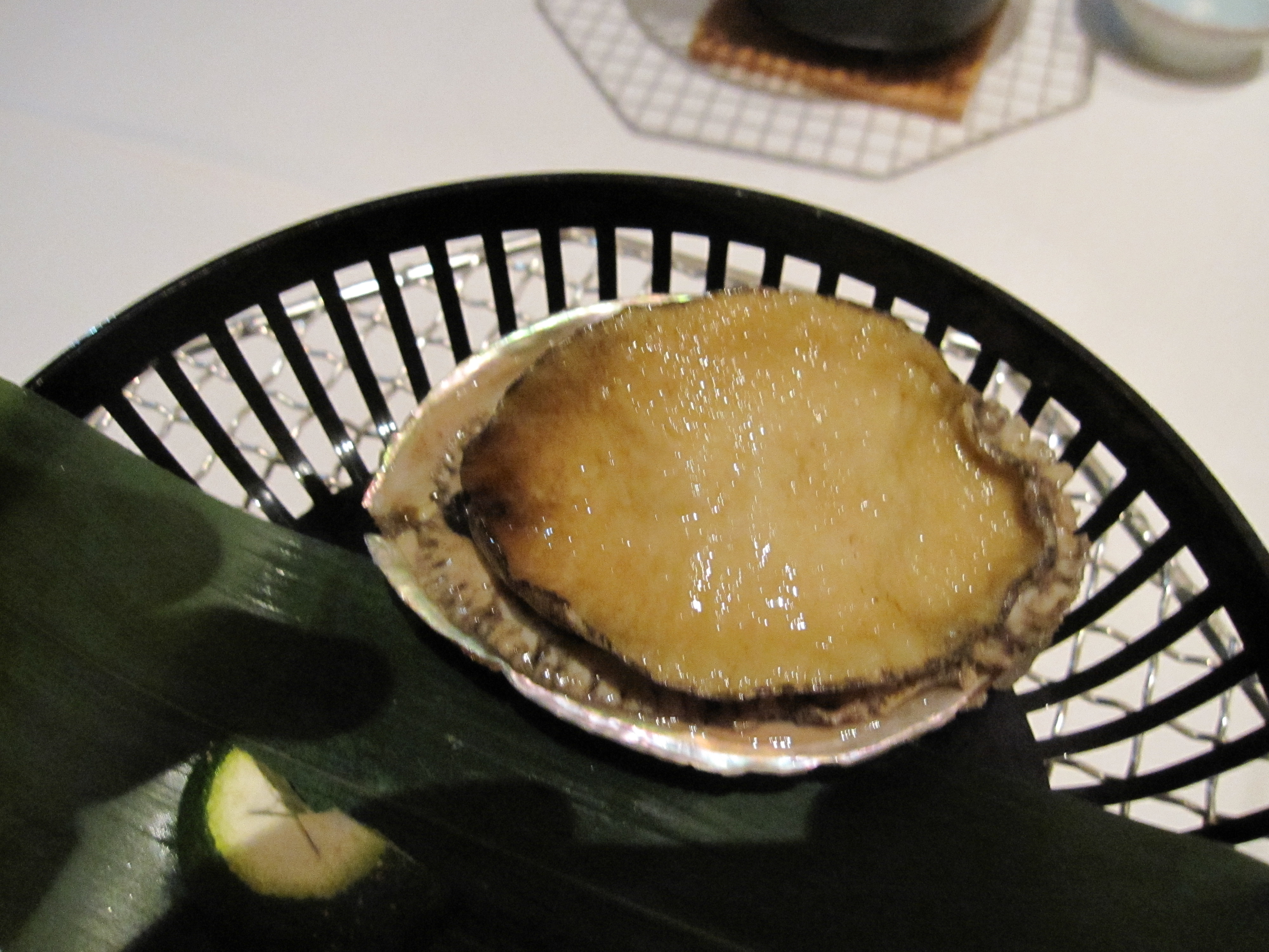 ところが、御部屋食ではなかったものの、想像以上に豪華な食事。あの値段でこの料理なら大満足。事前に私のお誕生日旅行をかねていることを言ったら、飲み物1杯ずつサービスですって!素敵!昼のお寿司を忘れるくらいワーワーいって食べていました。そのうちの1品、『アワビの悶え焼き』ですって。↓